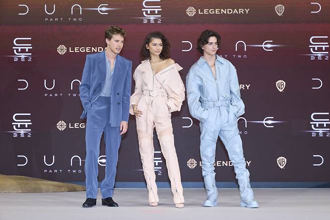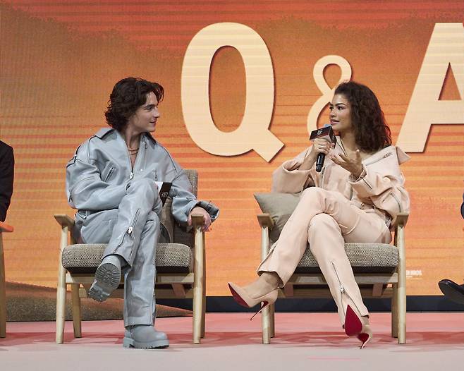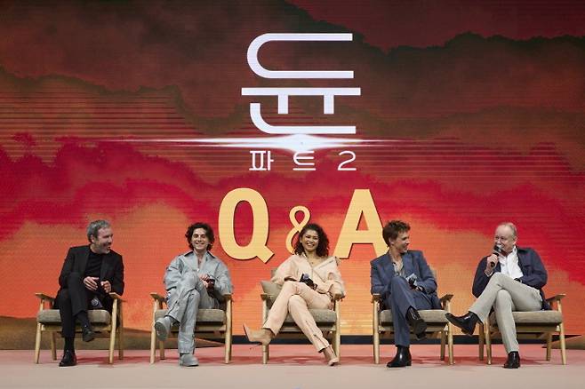 지난해 12월 한국을 찾아온 ‘드니 빌뇌브’ 감독과 2019년 부산국제영화제 이후 5년 만에 한국을 찾은 ‘티모시 샬라메’, 한국에 처음인 ‘젠데이아 콜먼’, ‘오스틴 버틀러’, ‘스텔란 스카스가드’까지 4인의 주역이 기자회견에 참여했다.