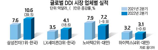 세계 DDI시장이 올해 2분기 34억1300만달러(약 4조9150억원)로 1분기 대비 8.1% 줄어든 상황에서도 한국 기업은 오히려 매출이 늘어난 셈이다.