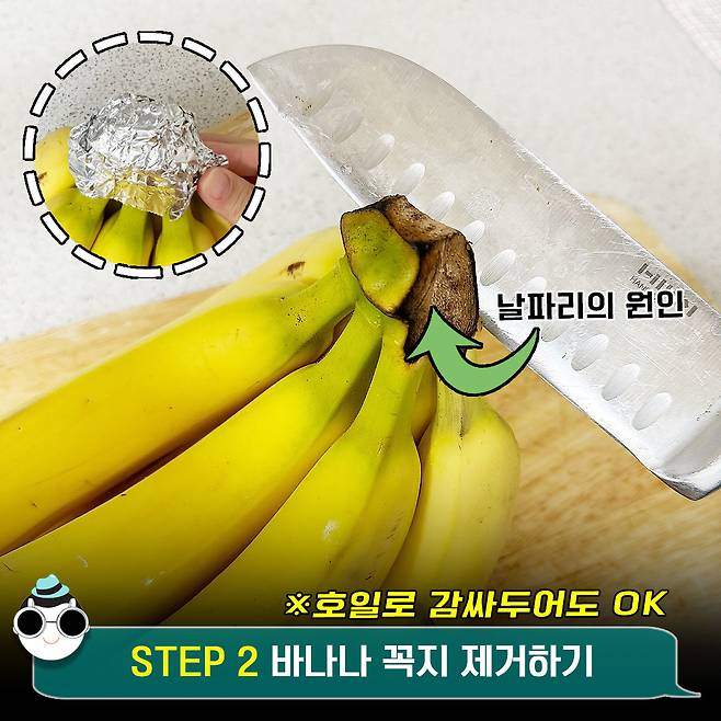 바나나 꼭지에는 초파리의 유충이 많이 있다는 사실! 그래서 장기관 보관하려면 호일로 꼭지를 꼭 감싸주거나 아예 싹둑 잘라버리는 편이 좋아요.