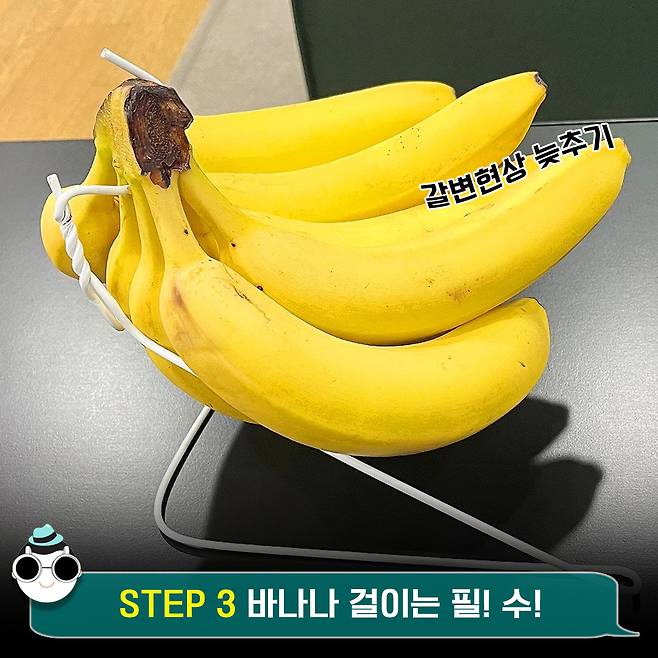 앞으로는 반드시 바나나 걸이에 꼭 걸어두는 게 좋아요. 바닥에 닿는 걸 최소화하면 갈변현상을 보다 늦출 수 있다고 해요.