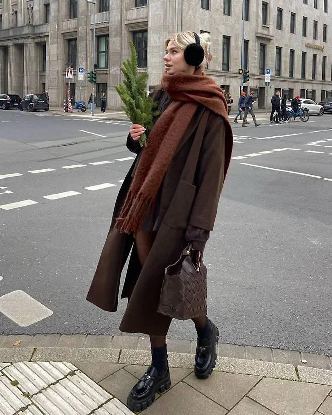 겨울에 뭐니뭐니 해도 따뜻하게 입는 게 최고죠. 브라운 컬러의 캐시미어 코트에 한층 더 밝은 톤의 모헤어 스카프를 반 바퀴 둘러 착용했습니다. 사실 코트만으로는 추워보일텐데 커다란 목도리가 숄 역할을 하는군요. (@linda.sza)