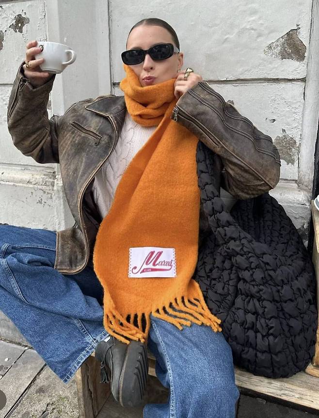 경쾌한 오렌지 컬러의 목도리를 빈티지 무드의 레더 재킷과 청바지와 함께 매치했습니다. 레트로풍 스타일링에도 제격이네요. (@lara_bsmnn)