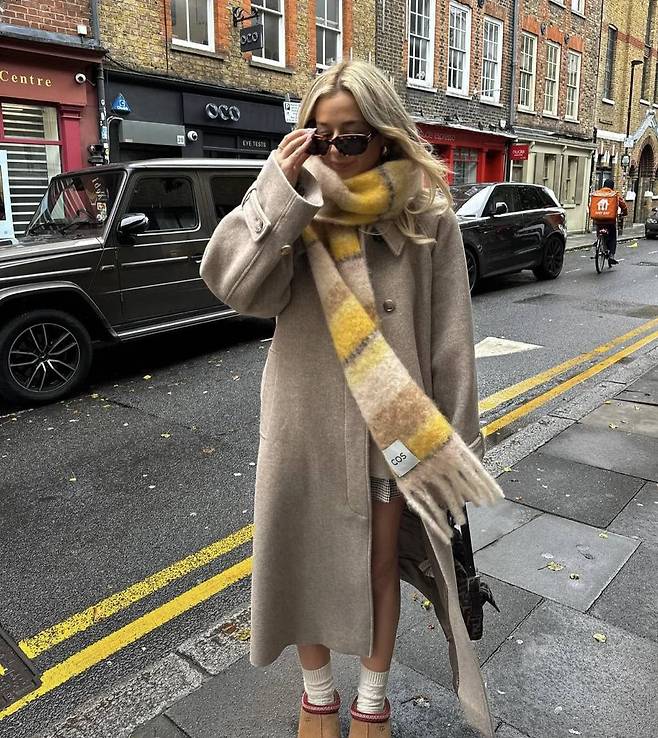 베이지 컬러의 코트에 베이지와 옐로우 컬러 조합이 돋보이는 머플러를 착용했네요. 보기만해도 따뜻함이 느껴지는 커다란 모헤어 소재에는 코지한 양말과 어그 슈즈를 신는 게 국룰이죠. (@chlosertoyou)
