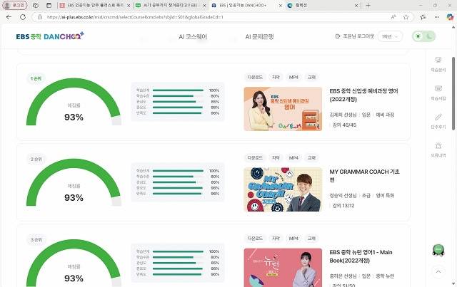 ‘AI 문제은행’ 서비스도 더욱 업그레이드됐습니다. 내가 푼 문제를 AI가 분석해 수능·모의고사·EBS 강의에서 딱 맞는 문제를 추천해줍니다. 화면에는 ‘내가 부족한 단원 TOP5’, ‘최근 학습한 단원 TOP5’라는 제목의 추천 문제와 더불어 AI 추천 강좌가 1~5순위까지 나타났습니다. 내게 필요한 공부가 무엇인지 파악하는 것만으로도 공부가 훨씬 수월해집니다.