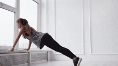 플랭크 자세에서 왼손으로 체중을 지탱하면서 오른손을 들어 왼쪽 어깨를 가볍게 터치합니다. 다시 손을 제자리로 내린 뒤, 이번에는 오른손으로 버티며 왼손을 들어 오른쪽 어깨를 터치하는 동작을 반복합니다.