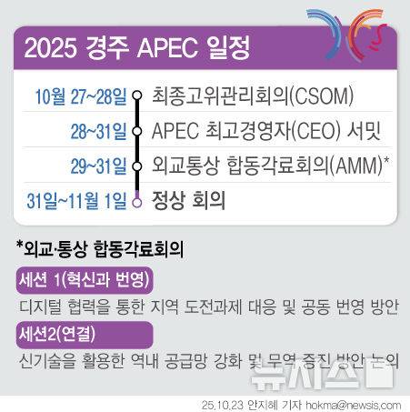 [서울=뉴시스] 23일 외교부에 따르면 오는 31일부터 내달 1일까지 열리는 APEC 정상회의를 앞두고 경주에서 27~28일 최종고위관리회의(CSOM), 29~30일 외교·통상 합동각료회의(AMM)가 개최된다. 이번 회의에는 21개 회원의 외교·통상 장관을 비롯해 APEC 옵서버, 경제협력개발기구(OECD) 및 세계무역기구(WTO) 사무총장이 초청 국제기구 대표로 참석할 예정이다. (그래픽=안지혜 기자)