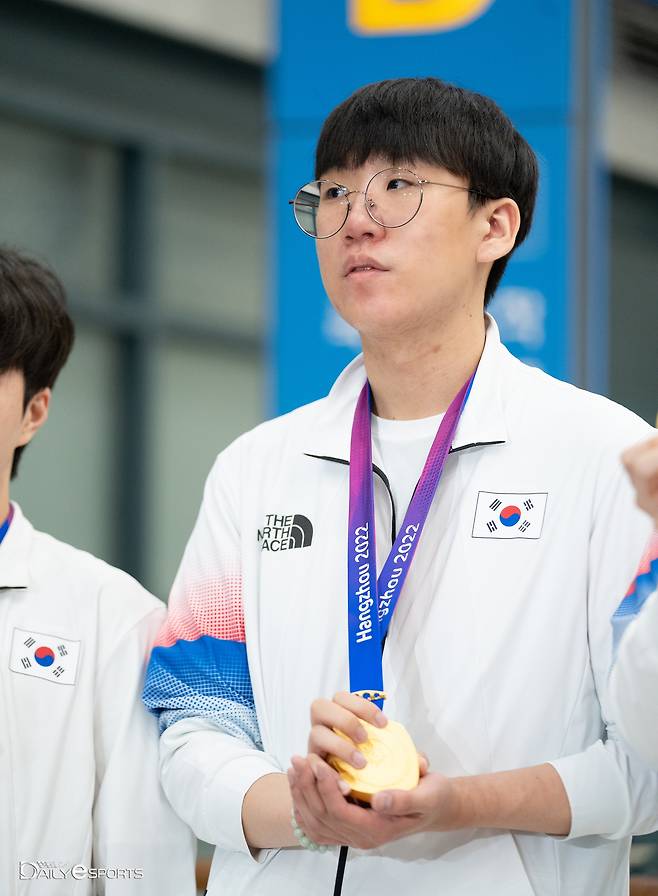 항저우 아시안게임서 금메달을 획득한 대한민국 리그 오브 레전드(LoL) 대표팀이 지난 달 30일 인천공항을 통해 입국했다. 징동 '룰러' 박재혁이 금메달을 손에 쥐고 있다.