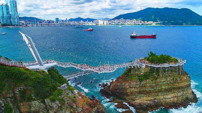 과거 송림공원에서 거북섬을 잇던 '구름다리'가 2002년 태풍으로 철거된 뒤, 18년 만에 암남공원과 동섬을 연결하는 현수교 형태로 재탄생했습니다.