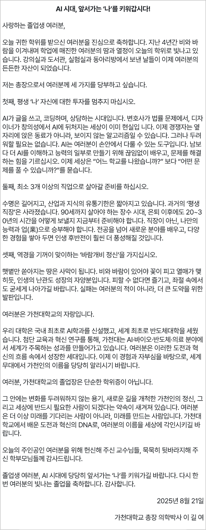 그러면서 "더 이상 미래를 기다리는 사람이 아니라, 미래를 만드는 사람으로 가천대학교에서 배운 도전과 혁신의 DNA로, 여러분의 이름을 세상에 각인시키길 바란다"라고 당부했다.