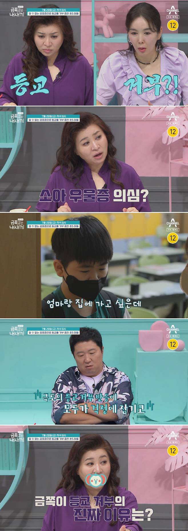 오늘(28일) 방송되는 채널A '요즘 육아 - 금쪽같은 내새끼'에서는 여름 방학 특집 '학교 다녀오겠습니다' 3탄, '알 수 없는 공포증으로 등교를 거부 중인 초5 아들'의 이야기가 공개된다.