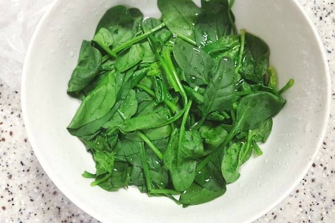 시금치를 물에 깨끗이 씻어주시고요. 전자레인지 가능한 오목한 용기에 담아줍니다.