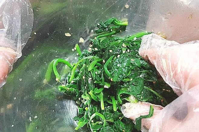 잠시 후 꺼내보면 약간 숨이 살아 있는데요. 너무 숨이 죽은 것보다 살짝 이렇게 데친 듯 안 데친 듯 숨이 살아 있는 상태가 딱 적당합니다.