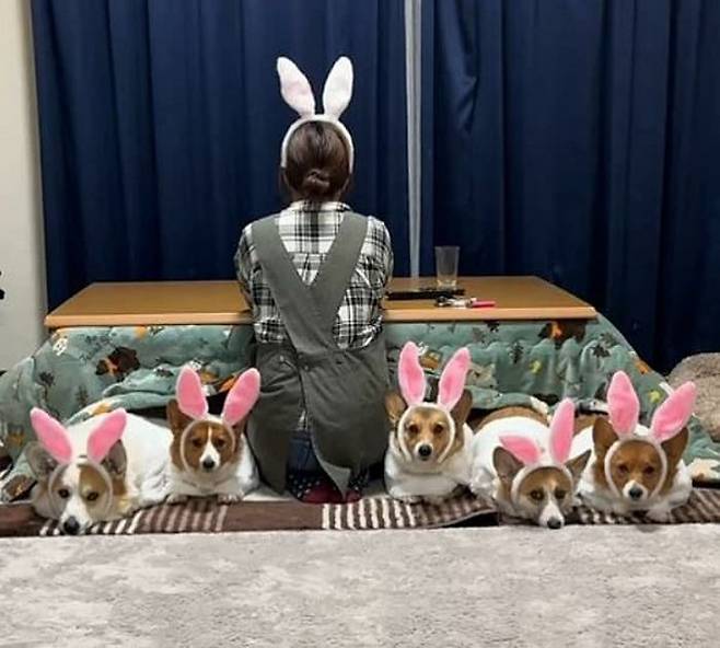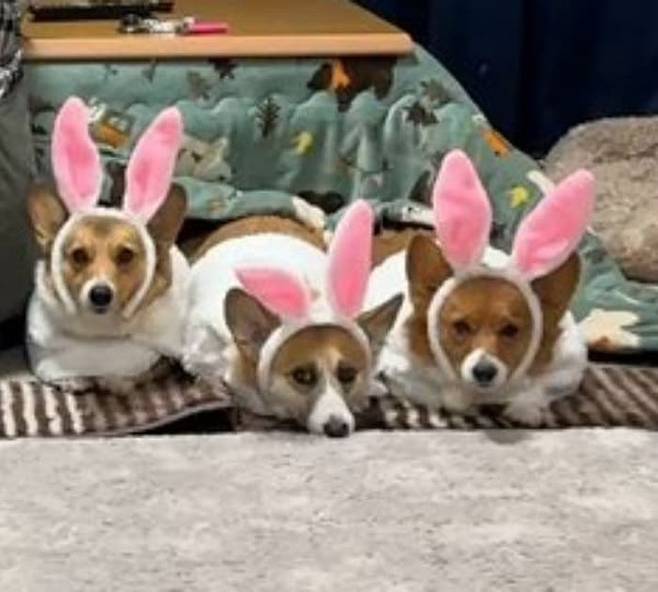 사연은 이렇습니다. SNS상에는 귀여운 웰시코기 강아지들이 각자 머리에 토끼 머리띠를 쓰고서 단체 사진을 찍은 모습이 담긴 사진이 올라온 것.
