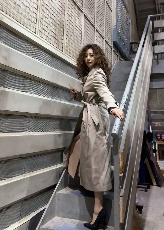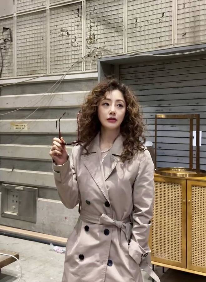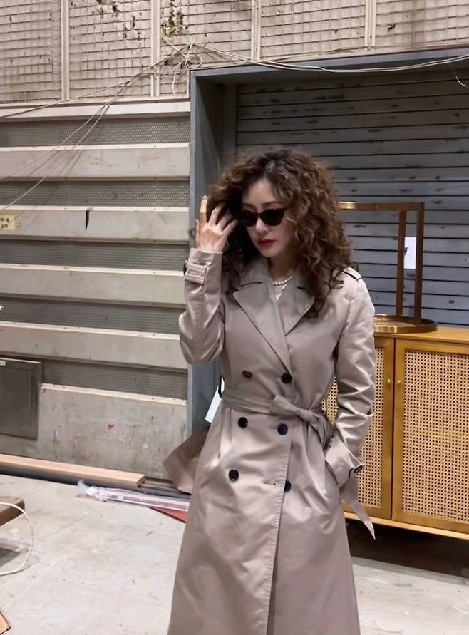 오나라는 클래식한 베이지 트렌치에 볼륨감 있는 펌 헤어를 더해 빈티지 무드를 완성했습니다.