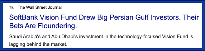 아래 기사 한 줄 설명을 보자. 사우디아라비아와 아부다비가 기술주 중심의 비전펀드에 투자를 했는데, 이 펀드가 시장 수익률에 못미치는 성과를 내고 있다는 내용이야. 왜 비전펀드의 베팅이 흔들린다고 했는지 이해가 되지?