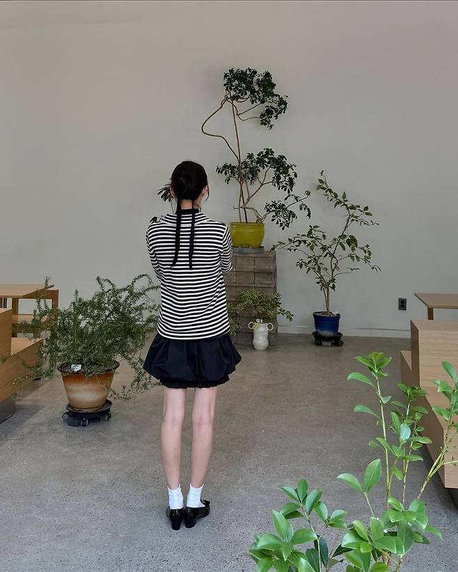 윤승아의 이 스타일은 데일리룩으로도 손색없고, 주말 카페 데이트나 전시회 나들이용으로도 제격이다. 비슷한 무드를 연출하고 싶다면 얇은 골지 소재의 스트라이프 니트와 하이웨이스트 플레어 스커트, 그리고 메리제인 힐에 발목 양말을 매치해보자. 미니멀한 블랙백을 들어주면 한 끗 다른 무드를 완성할 수 있다.