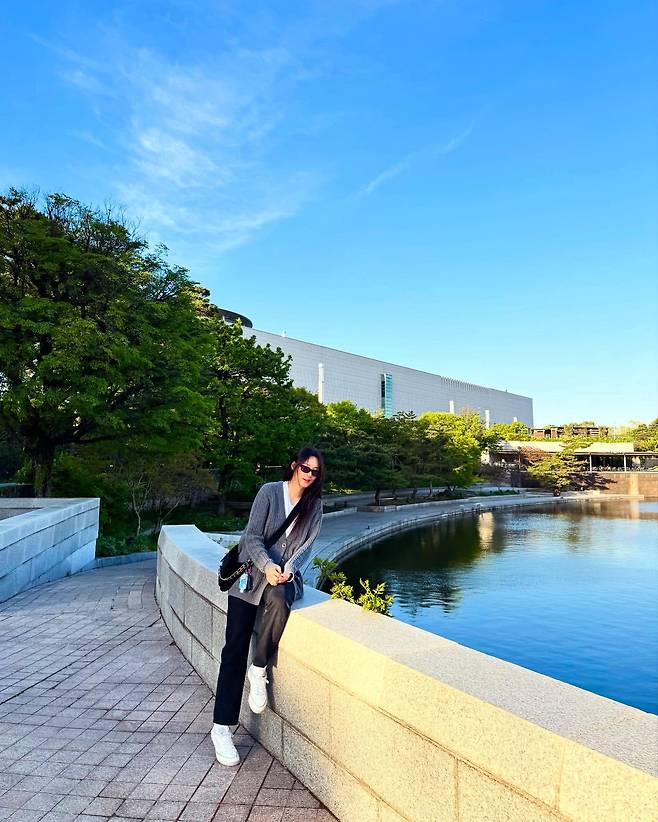 푸른 하늘과 호수를 배경으로 그레이 니트 카디건과 블랙 팬츠의 모노톤 룩을 선보이고 있다. 편안한 실루엣의 카디건과 슬림한 팬츠의 조합이 세련된 캐주얼 무드를 자아내며, 화이트 스니커즈와 블랙 크로스백으로 실용성을 더했다. 선글라스로 포인트를 준 이 룩은 도심 속 자연을 즐기는 여유로운 주말 패션을 완벽하게 연출하고 있다.