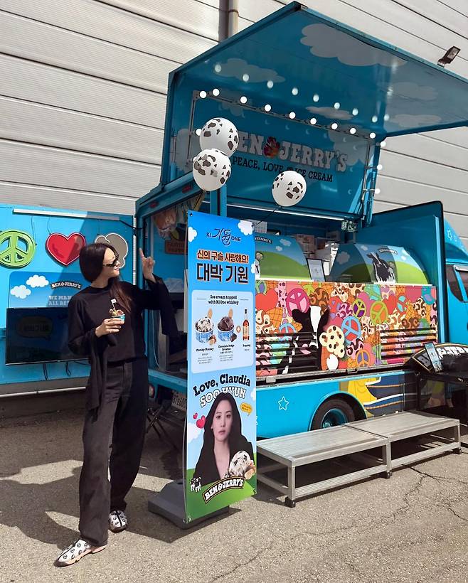 벤앤제리스 팝업 스토어 앞에서 수현이 시크한 올블랙 룩을 선보이고 있다. 블랙 오버사이즈 스웨트셔츠와 와이드 팬츠의 조합으로 편안하면서도 세련된 스트리트 패션을 완성했다. 유니크한 패턴의 슬라이드 슈즈로 포인트를 주었으며, 선글라스로 도시적인 감각을 더했다. 컬러풀한 아이스크림 트럭과 대비되는 모노톤 룩이 배우의 세련된 패션 감각을 돋보이게 하고 있다.