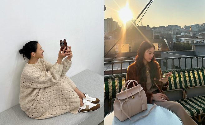 배우 수현이 도심 속 루프탑 카페에서 따스한 햇살을 배경으로 세련된 가을 패션을 선보이고 있다. 브라운 컬러의 카디건과 베이지 톤 이너웨어의 조화가 가을 분위기를 물씬 풍기며, 베이지 컬러의 미니멀한 토트백으로 세련미를 더했다. 특히 일몰의 황금빛 조명이 그녀의 실루엣을 부드럽게 감싸며 로맨틱한 분위기를 연출하고 있다.