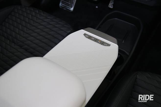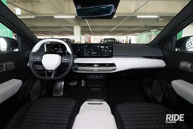 실내는 최근 기아 제품들이 추구하는 방향을 잘 보여주는 듯하다. 계기판과 공조장치 제어부, 인포테인먼트 스크린을 하나로 이은 와이드 디스플레이와 중앙 송풍구 상하로 배치된 단축메뉴 버튼과 공조장치 주요 기능 조절용 레버를 배치했는데 전체 디자인을 해치지 않는 형태로 구성되어 깔끔한 실내 모습을 만드는데 일조한다. 좌우 앞좌석 사이로 보통 콘솔 박스를 배치하지만 EV4는 이를 없앤 대신 슬라이딩 테이블을 배치해 필요에 맞춰 쓸 수 있다. 그리고 마치 콘솔박스 뚜껑처럼 생긴 부분은 뒤로 펼쳐 사용할 수 있어 이동 중 간단하게 음식을 먹거나 노트북 등으로 작업할 때 편리하다. 기존과는 다른 디자인으로 이 주변에 배치되는 버튼을 다른 곳으로 옮겨야 했고 시트 관련 버튼들은 도어 레버 옆으로 옮겼는데 디자인을 일치시켜 어색함 없이 잘 어우러진다.