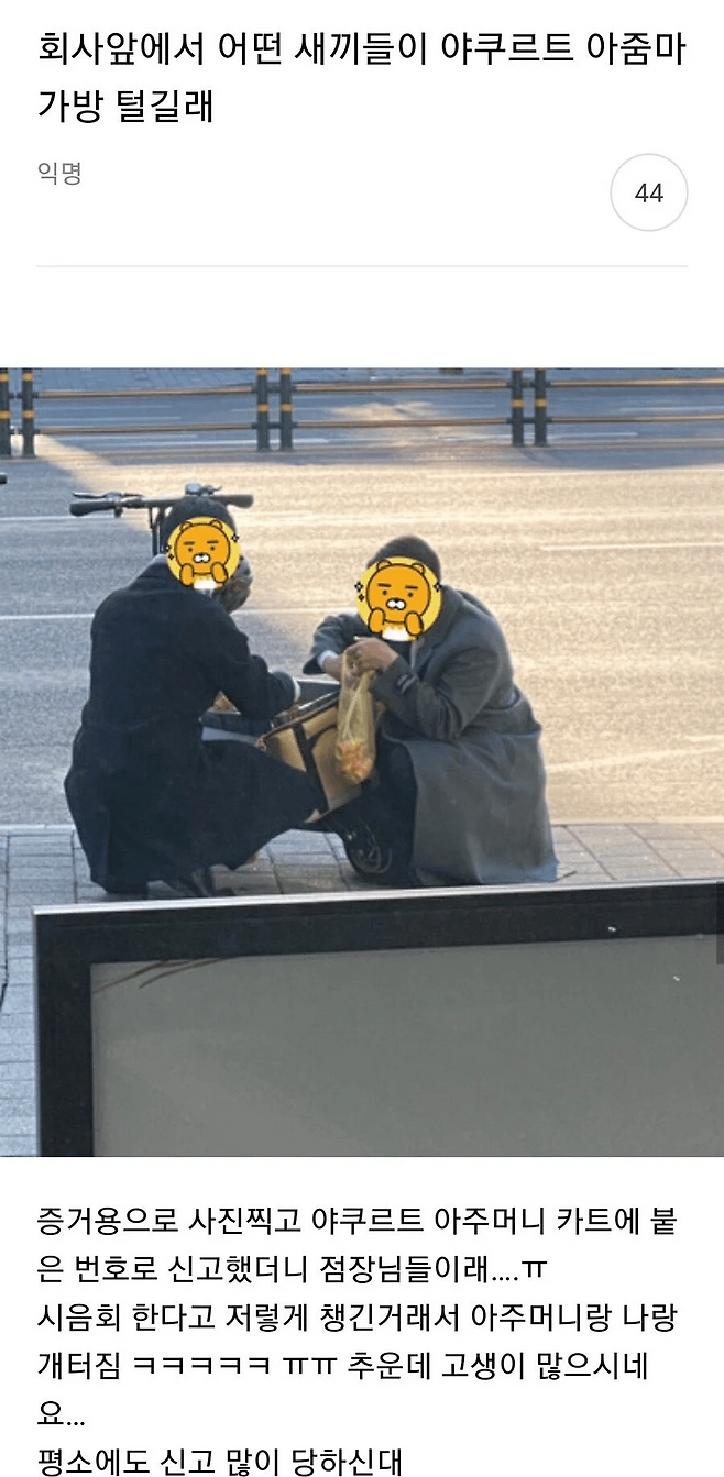 길거리에서 남자들이 야쿠르트 아줌마 가방 털길래 신고했는데