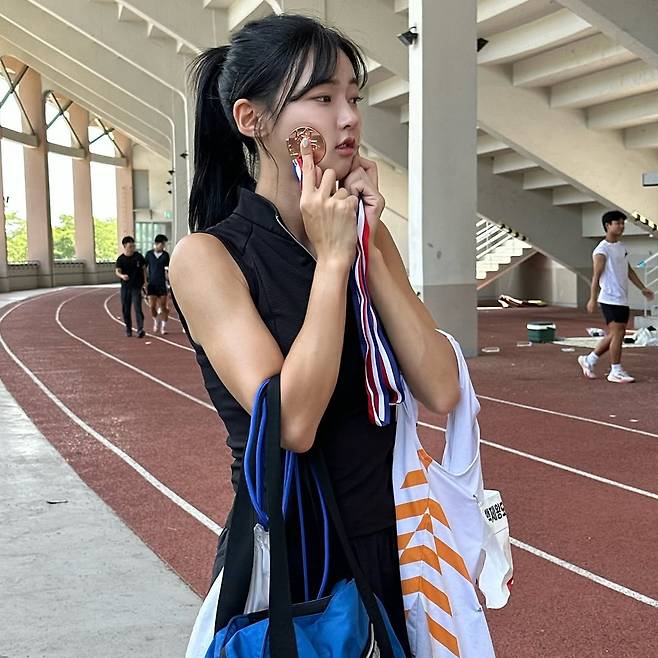 사진 속 그는 검정 민소매 톱과 러닝 쇼츠 차림으로 트랙 한복판에 서 있다. 자연스레 길게 늘어뜨린 머리카락엔 여름 땀방울이 맺혀 있고, 어깨에는 운동가방이 자리해 있다.