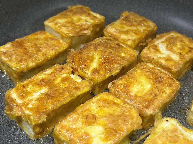 이제 약불에서 두부를 천천히 굽습니다. 겉면이 노릇하게 익을 때까지 뒤집지 말고 기다리는 것이 중요합니다. 너무 자주 뒤집으면 계란옷이 벗겨지거나 형태가 쉽게 망가집니다.