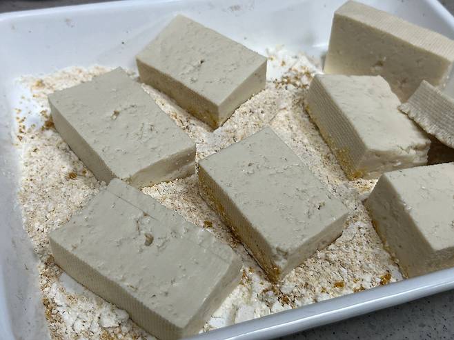 두부에 골고루 부침가루를 묻혀 주세요. 너무 덩어리 지지 않도록 한 번씩 털어냅니다.