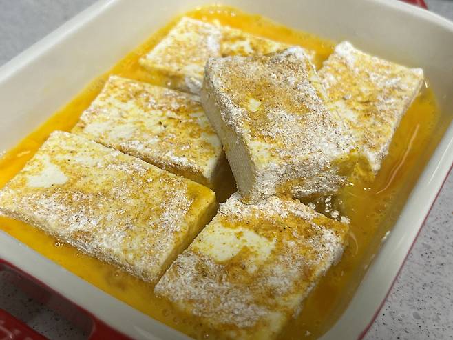 부침가루를 묻힌 두부는 다시 계란 푼 물에 넣어서 계란옷을 입혀 주세요. 부침가루와 계란이 겉면을 감싸주면서 겉은 바삭하고 속은 촉촉한 식감이 살아납니다.