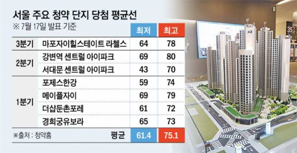 올해 서울 아파트 당첨 평균 최저 가점은 지난해와 비교하면 10점 이상 오른 수준으로, 집값이 큰 폭으로 올랐던 2021년 상반기 수준과 맞먹는다. 분양업계 통계를 취합한 결과 2021년 상반기 최저 당첨 가점은 61.1점으로 조사됐다.