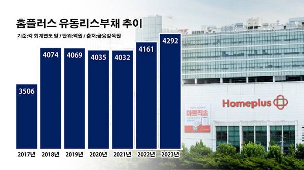 6일 금융감독원 전자공시시스템에 따르면 2월 말 결산 법인인 홈플러스의 2023회계연도 말 기준 유동리스부채는 4292억원이었다. 리스부채는 회사가 일정 기간 부동산이나 설비, 기타 고정자산을 빌린 대가로 내야 할 임대료를 계산해둔 항목이다. 그 중 유동리스부채는 결산일로부터 1년 동안 지급해야 할 리스료만 따로 구분한 금액이다.