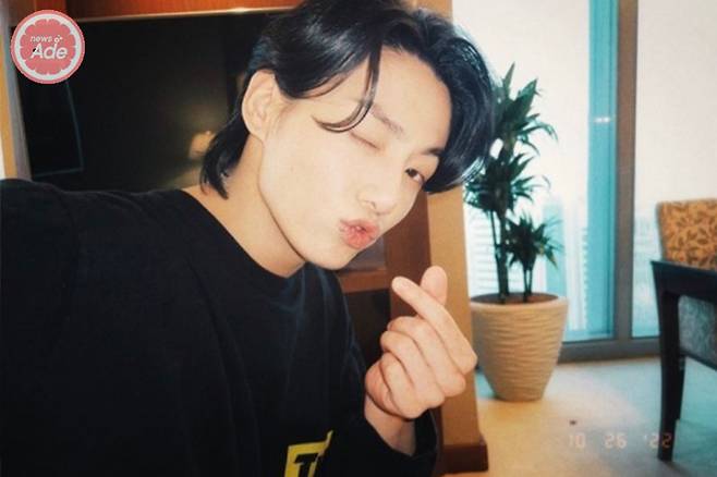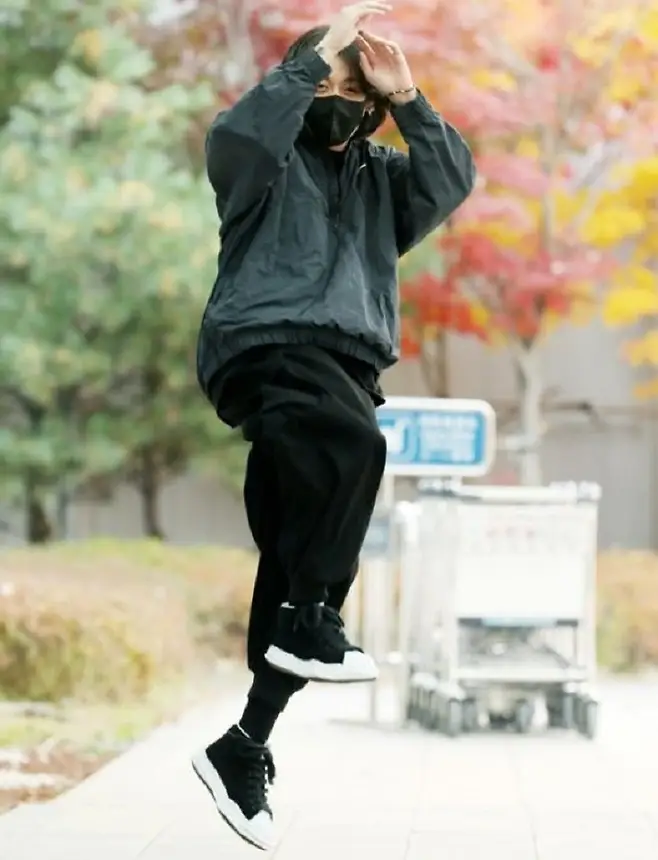 차에서 내린 정국은 들고 있던 가방을 바닥에 내려놓은 뒤 축구 국가대표 선수들을 응원하는 힘찬 골 세리머니 포즈를 취해 훈훈함을 자아냈다.
