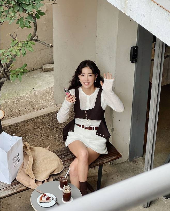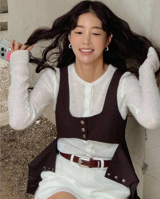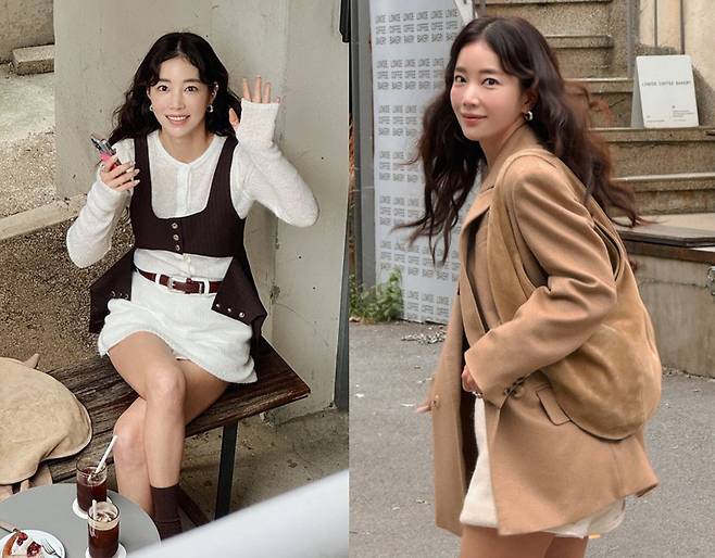여기에 기은세는 브라운 톤의 베스트를 레이어드하고 치마에 벨트를 둘러 도회적이고 스타일리시한 포인트를 주었습니다.