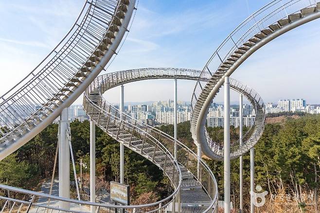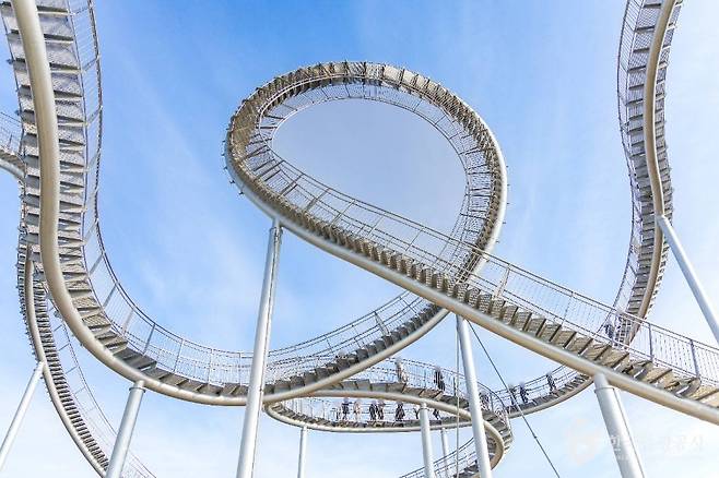 이 과정에서 설계를 맡은 이들은 세계적인 체험형 예술 작가 부부, 하이케 무터와 울리히 겐츠였습니다. 이들은 포항을 여러 차례 직접 방문하며 ‘철과 빛의 도시’라는 지역의 정체성을 공간 언어로 풀어냈고, 그 결과 철로 그린 곡선 위를 사람이 걷는 전혀 새로운 형태의 구조물이 구상됩니다.