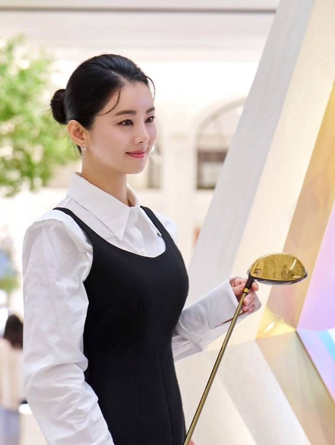 흰색 셔츠 위에 몸에 꼭 맞는 검은색 슬리브리스 상의를 겹쳐 입어 단정하고 세련된 블랙 앤 화이트 룩을 완성했다. 머리는 깔끔하게 묶어 올리고, 작은 드롭 귀걸이를 착용하여 단아한 매력을 극대화했다.