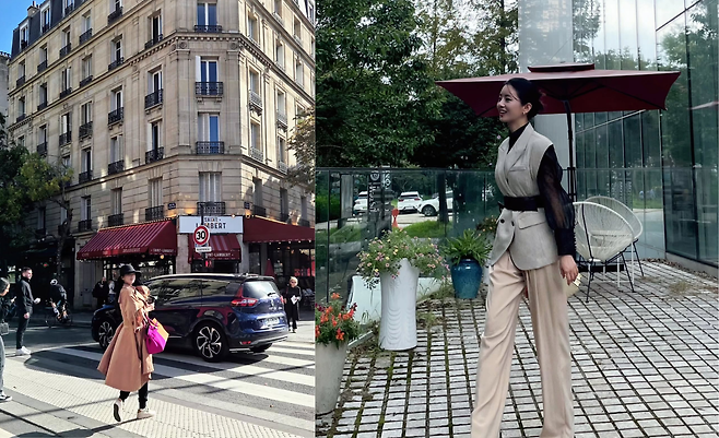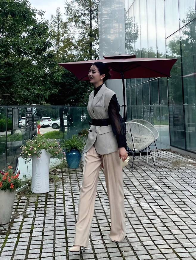 속이 비치는 검은색 시스루 블라우스 위에 베이지색 조끼를 걸치고, 같은 색상의 와이드 팬츠를 착용해 통일감을 주었다. 특히 두꺼운 검은색 벨트로 허리선을 강조하여 전체적인 실루엣에 안정감을 더하며 시크한 분위기를 자아냈다.