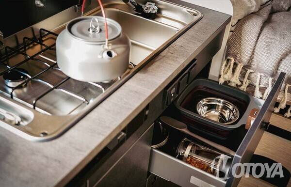주방은 클래스 B 모델에서 쉽게 찾아볼 수 없는 크기를 자랑한다. 보통 좁은 주방 상판을 넓게 사용하기 위해 확장 패널을 장착하는 것이 보통이다. 그러나 클리프 600RT 모델에서는 이를 찾아볼 수 없고 자체 상판을 사용할 정도로 크기가 큰 상판을 가지고 있다.