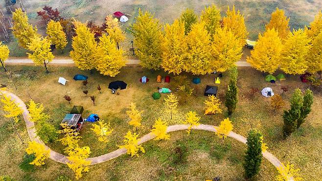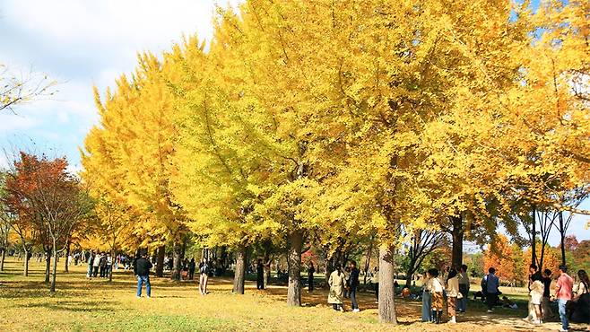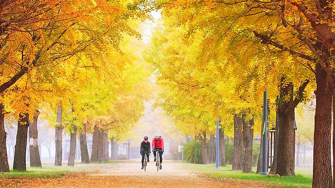 가을이면 은행나무길과 억새밭이 어우러진 환상적인 풍경이 펼쳐지고, 오후의 햇살이 그 위로 황금빛을 더한다.