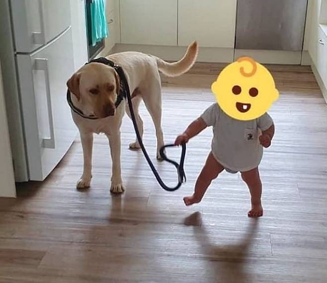 공개된 사진 속에는 걸음마를 이제 막 뗀 아기가 리트리버 강아지의 리드줄을 붙잡고서 산책을 나가려는 듯 뒤뚱뒤뚱 걸어가고 있었죠.