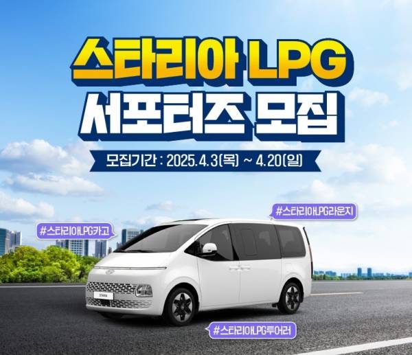 대한LPG협회가 스타리아 LPG 차량의 실사용자 경험을 확산하기 위해 ‘스타리아 LPG 서포터즈’를 모집한다. 스타리아 카고ㆍ투어러ㆍ라운지ㆍ킨더 등 LPG 모델 운전자라면 누구나 지원할 수 있다.