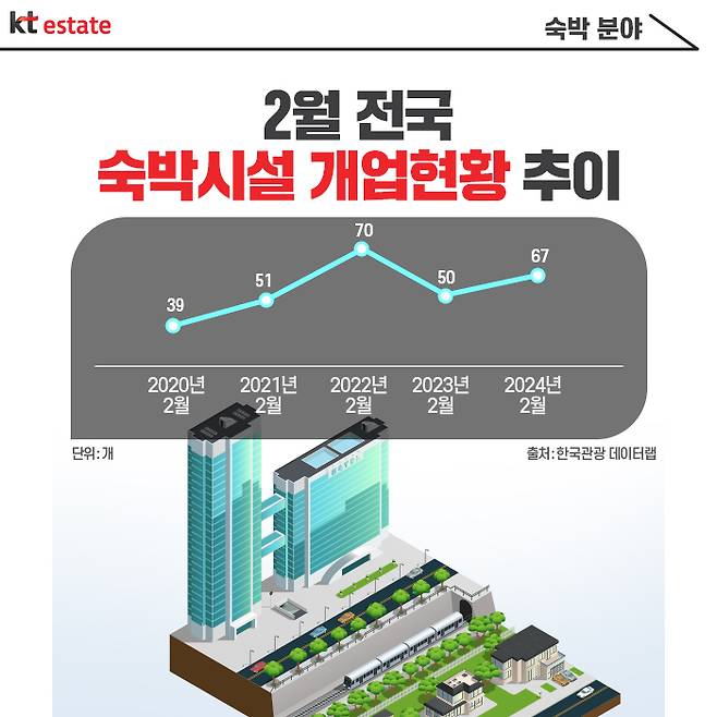 숙박시장은 코로나 엔데믹 이후 전반적으로 회복세가 만연합니다. 한국관광 데이터랩에 의하면 전국 숙박시설 개업현황은 2월 기준으로 67개가 증가했습니다.