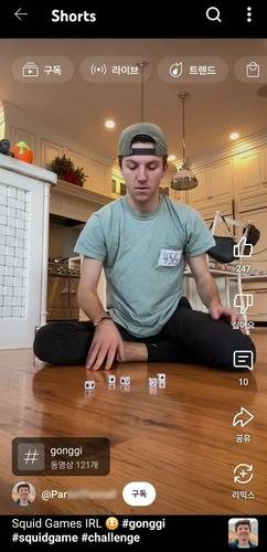 유튜브 누리꾼 'Par***'은 '456'을 이름표처럼 가슴에 붙인 채 공깃돌 대신 주사위를 이용해 공기놀이를 해보는 영상을 올렸다. '456'은 '오징어 게임' 주인공 성기훈(이정재 분)의 게임 참가번호다.