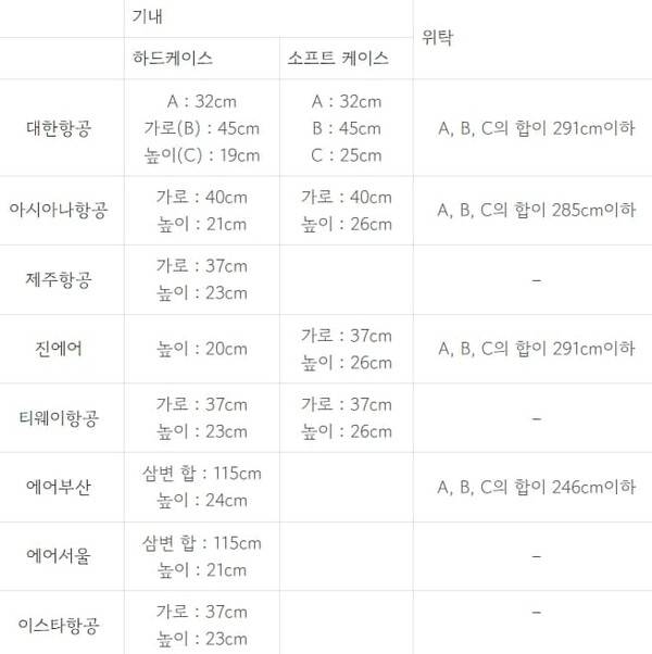 소프트 케이스의 경우 윗부분이 접히기 때문에 기본 높이가 더 높아도 상관없습니다. 다만 소프트 케이스도 좌석 아래 두어야되기 때문에 기본적으로 접혔을 때 하드 케이스 기준을 충족해야합니다.