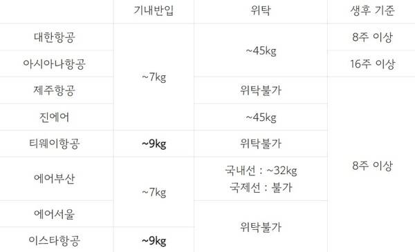항공사별 반려동뭉 탑승 무게( 반려동물무게+케이지) 기준입니다. 평균적으로 7kg이하일때에는 기내 탑승이 가능하며 티웨이, 이스타항공의 경우 9kg까지 가능합니다.