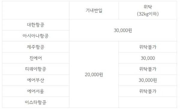 항공사별 반려동물 탑승 시 운송요금 기준입니다. 국내선은 2~3만원 수준이며 국제선은 노선에 따라서 100,000원~300,000만원까지 다르니 참고하시기 바랍니다.