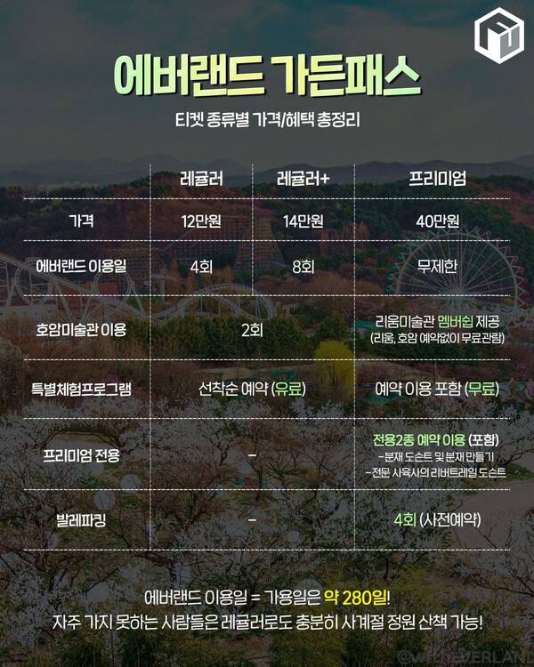 반면 정원과 꽃, 수목을 사랑하는 분이라면 연 40만원의 프리미엄 티켓을 구입해도 좋습니다. 다만 하루 자유이용권 가격을 고려한다면 연 20회 내외로 에버랜드를 방문하거나, 10~15회 방문해 특별 프로그램과 전용프로그램을 모두 참가한다면 알차게 정기권을 이용할 수 있겠습니다.