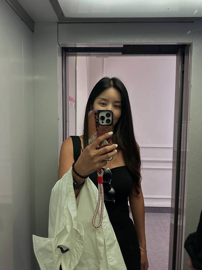 엘리베이터에서 포착된 모습에서는 블랙 미니 드레스로 세련된 도시적 매력을 선보이고 있다. 패턴이 들어간 핸드폰 케이스와 펄 목걸이 등 소품 활용으로 포인트를 주며, 라이트 그린 재킷을 어깨에 걸쳐 레이어드 스타일링을 연출하고 있다.