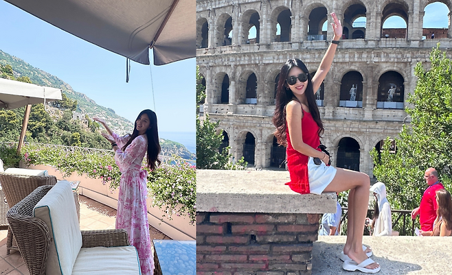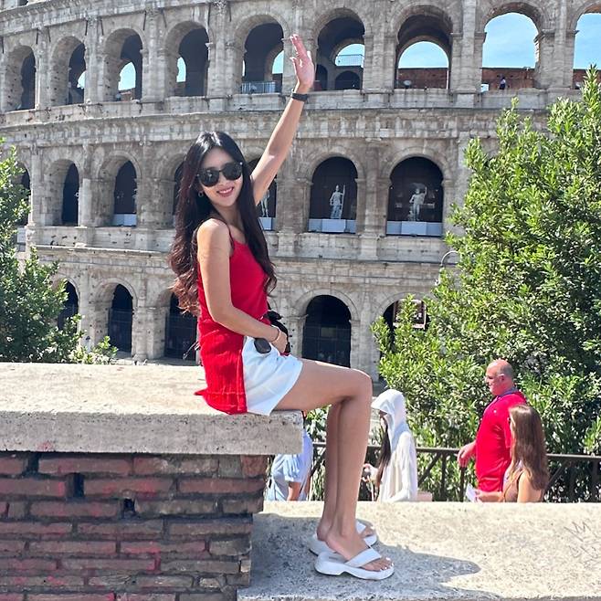 이탈리아 로마 콜로세움을 배경으로 한 사진에서는 선명한 레드 미니 드레스를 착용해 관광지와 어우러지는 밝고 경쾌한 분위기를 연출하고 있다. 화이트 슬리퍼와의 조화로 편안하면서도 스타일리시한 여행 패션을 완성하고 있다.