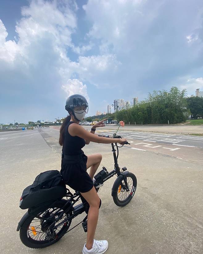 박솔미는 자전거와 함께한 야외 활동에서 블랙 탱크톱과 쇼츠를 매치한 스포티한 룩을 연출하고 있다. 헬멧을 착용하면서도 세련된 분위기를 유지하며, 화이트 운동화로 깔끔함을 더했다. 자전거 뒤편의 짐가방까지 실용적인 스타일링을 완성하고 있다.