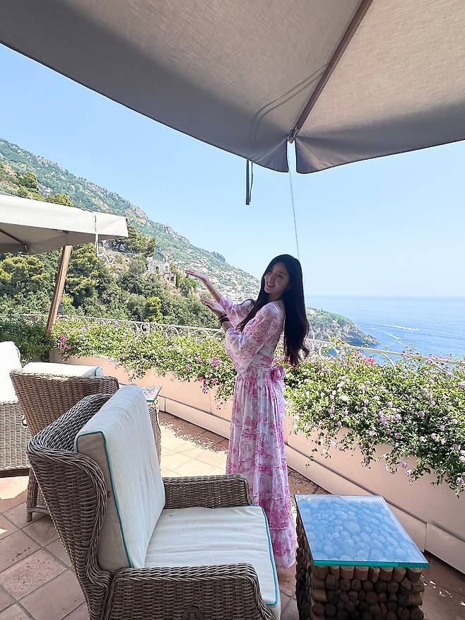 해안가 테라스에서는 핑크 톤의 플로럴 프린트 맥시 드레스를 선택해 로맨틱하고 페미닌한 분위기를 연출하고 있다. 자연스러운 웨이브 헤어와 함께 여유로운 휴양지 패션의 정수를 보여주고 있다.